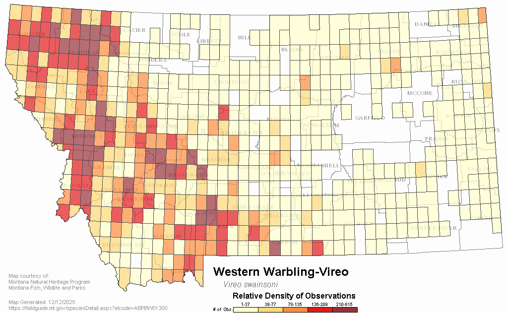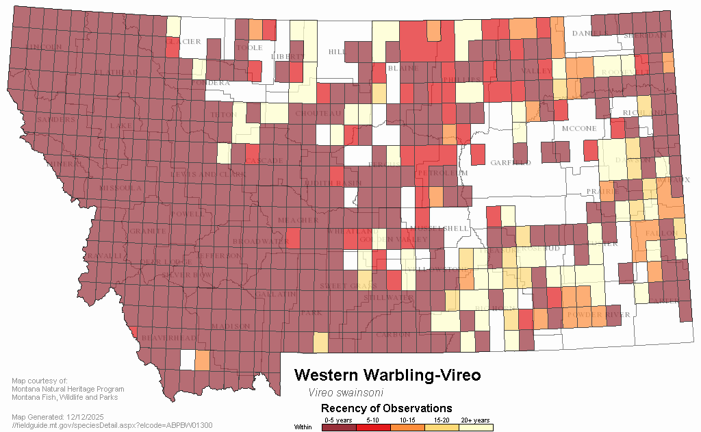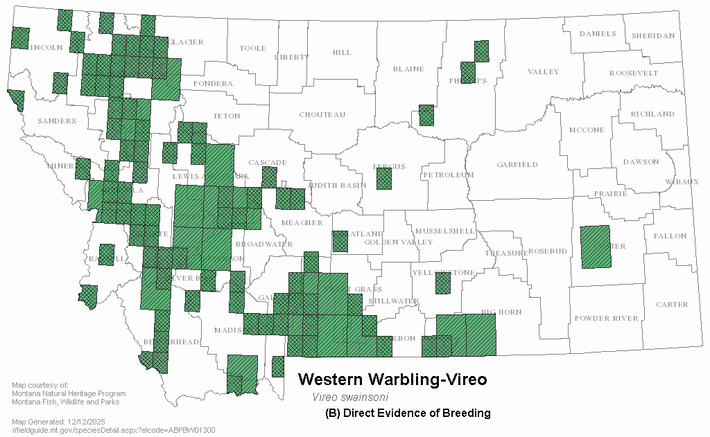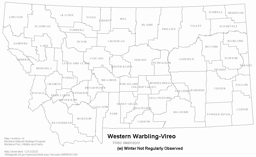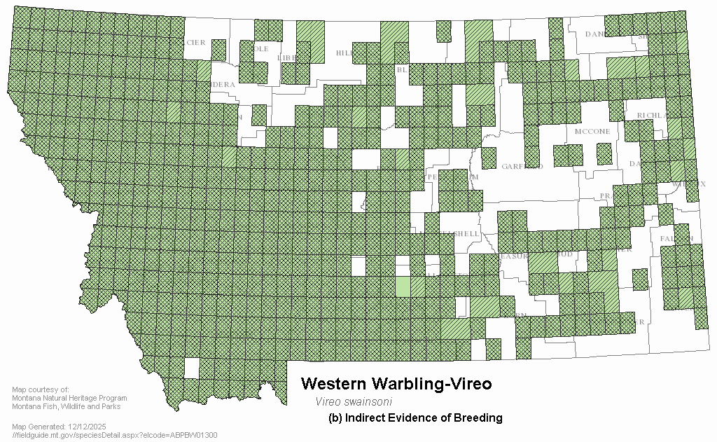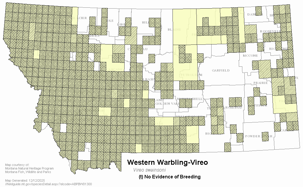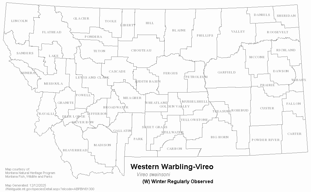 Literature Cited AboveLegend: View Online Publication Gardali, T., and G. Ballard. 2000. Warbling Vireo (Vireo gilvus). In The birds of North America, No. 551 (A. Poole and F. Gill, Eds.). Academy of Natural Sciences of Philadelphia and American Ornithologists’ Union. Marks, J.S., P. Hendricks, and D. Casey. 2016. Birds of Montana. Arrington, VA. Buteo Books. 659 pages.