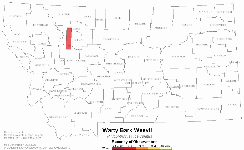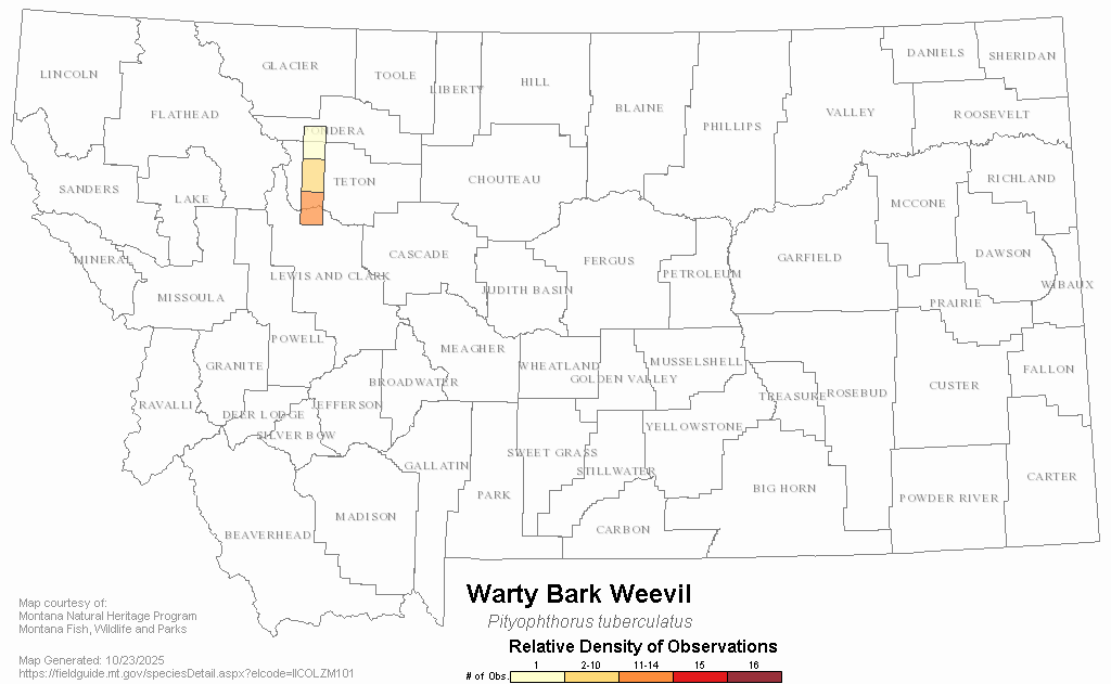 Warty Bark Weevil — Pityophthorus tuberculatus.  Montana Field Guide.  .  Retrieved on , from