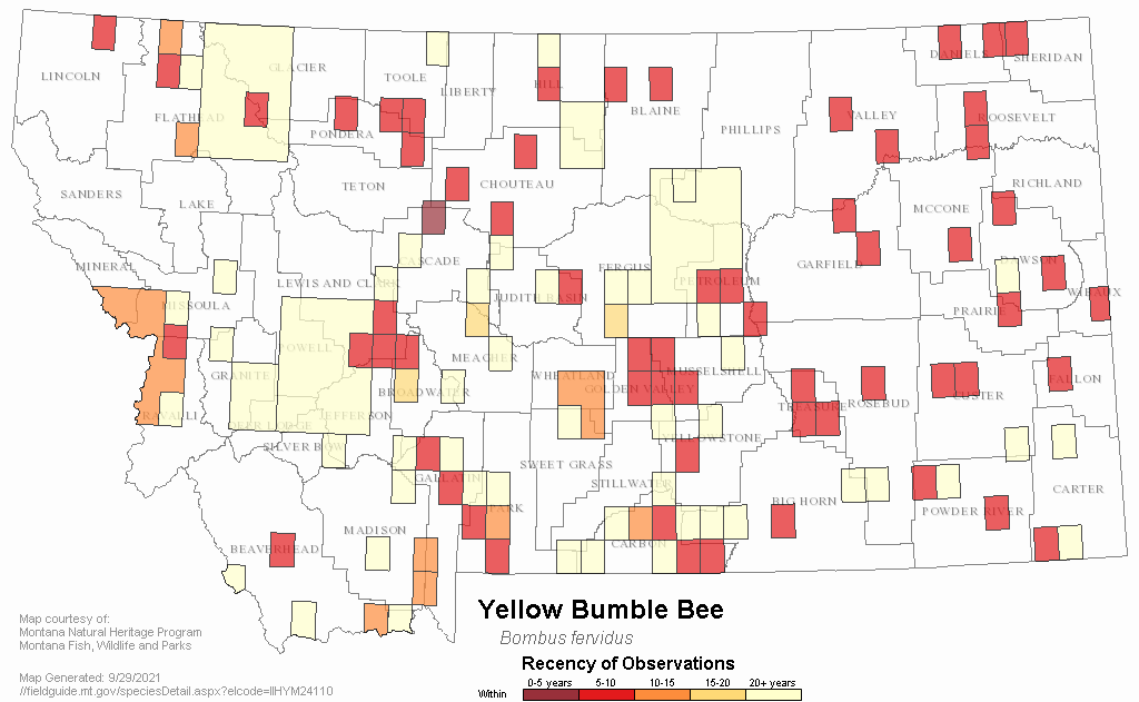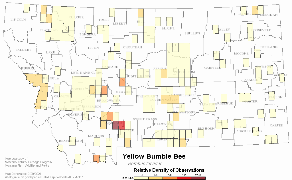 Koch et al. (2018) conducted morphometric and genetic analysis to examine the phylogenetic relationships of Bombus fervidus and Bombus californicus, both of which occur in Montana, and concurred with previous studies that individuals cannot be identified to species based on current taxonomy (i.e., setal color). However, Koch et al. (2018) found: (1) microsatellite genotypes have the capacity to identify two distinct genetic lineages in the Bombus fervidus species complex in areas where the species are broadly sympatric and using the same habitats (including within Montana); (2) sympatric populations within the species complex appear to be phenotypically divergent and reproductively isolated with no evidence of recent introgression (diverging from a common ancestor likely less than ~1 million years ago); and (3) future research evaluating taxonomic characters like wing venation in conjunction with genetic analysis may identify morphological methods for distinguishing between these currently cryptic species.