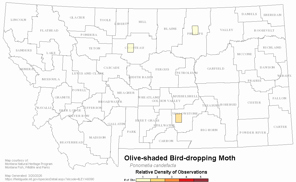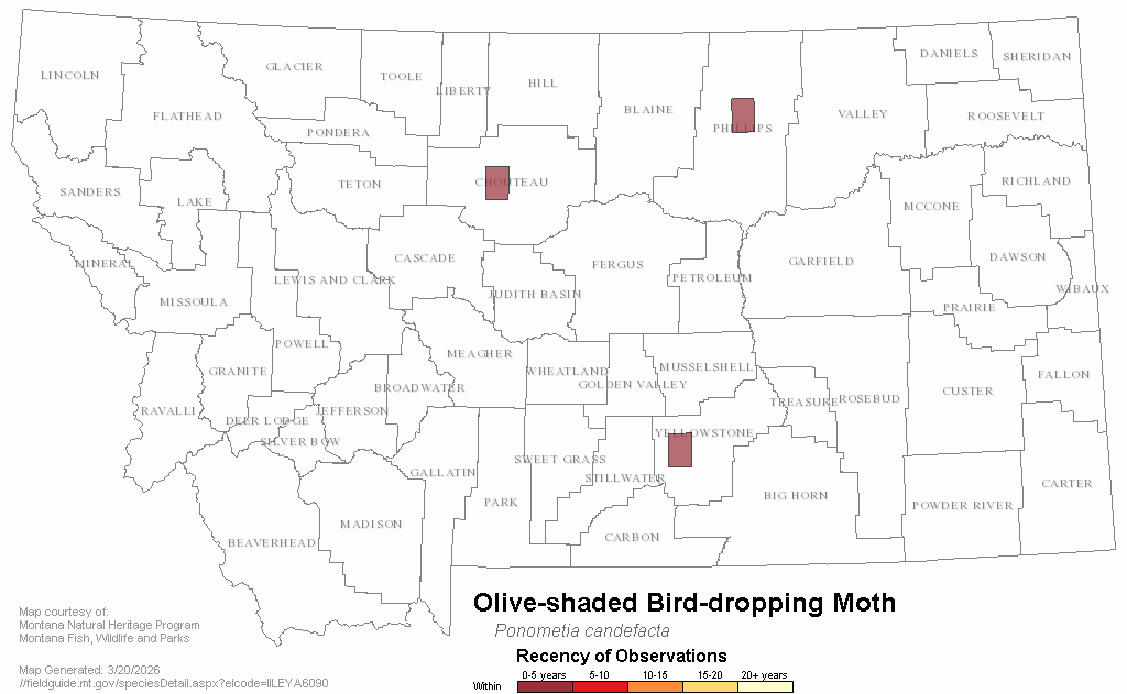 Olive-shaded Bird-dropping Moth — Ponometia candefacta.  Montana Field Guide.  .  Retrieved on , from
