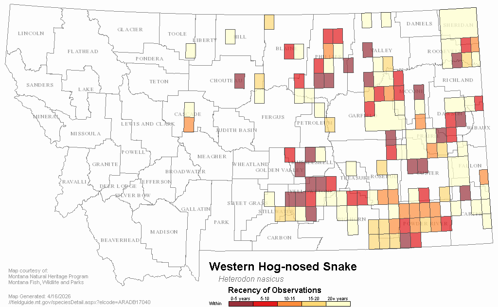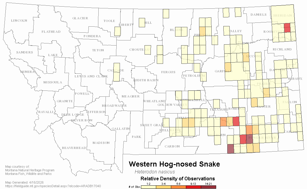 Western Hog-nosed Snakes appear to be sparsely distributed in the Great Plains region of eastern and north central Montana. In addition, documented occurrences of the species in the state have declined in recent years, and the status of