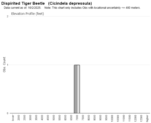 Tiger beetle life cycles fit two general categories. “Spring-fall” beetles emerge as adults in late summer and fall, then overwinter in burrows before emerging again in spring when mature and ready to mate and lay eggs. The life cycle may take 1-4 years. “Summer” beetles emerge as adults in early summer, then mate and lay eggs before dying. The life cycle may take 1-2 years, possibly longer depending on latitude and elevation (Kippenhan 1994, Knisley and Schultz 1997, and Leonard and Bell 1999). Cicindela depressula has a spring-fall life cycle. Adults at lower and coastal elevations are active from April to July and August to October, montane populations early May to early October (Larochelle and Larivière 2001, and Pearson et al. 2015). Adults from Idaho near the Montana border have been reported in August and September (iNaturalist 2023).