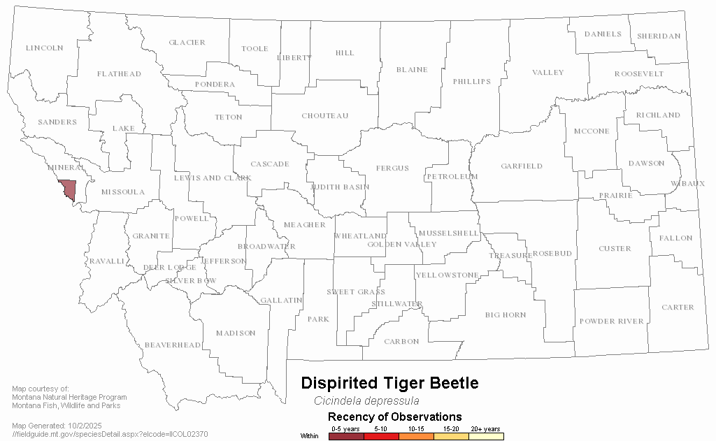 Cicindela depressula occurs from the coastal regions of northern British Columbia south along the Pacific coast to central California, and in the interior mountains from the Cascades south through the Sierra Nevada and across southern British Columbia to the Rocky Mountains, then south along the northern Idaho and Montana border. Status in Montana is uncertain, but reports from Idaho, in Idaho County (Shook 1984) and more recently in Clearwater County (iNaturalist 2023), some of which are on the border with Mineral County, Montana (Kristi Dubois personal communication 2023), indicate this species is likely present in the area of Montana depicted by the current range map (Pearson et al. 2015). Additional survey coverage in that area is desirable.