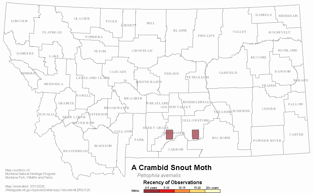 A Crambid Snout Moth — Petrophila avernalis.  Montana Field Guide.  .  Retrieved on , from
