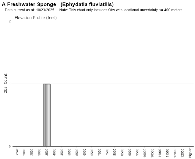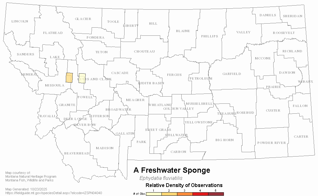This Freshwater Sponge is currently ranked a "S1S3" Species of Concern in MT and is at risk because of very limited and/or potentially declining population numbers, range and/or habitat, making it vulnerable to extirpation in the state. Known from a few locations in lakes of northwest Montana.