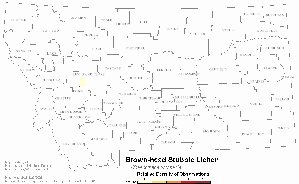Brown-head Stubble Lichen — Chaenotheca brunneola.  Montana Field Guide.  .  Retrieved on , from