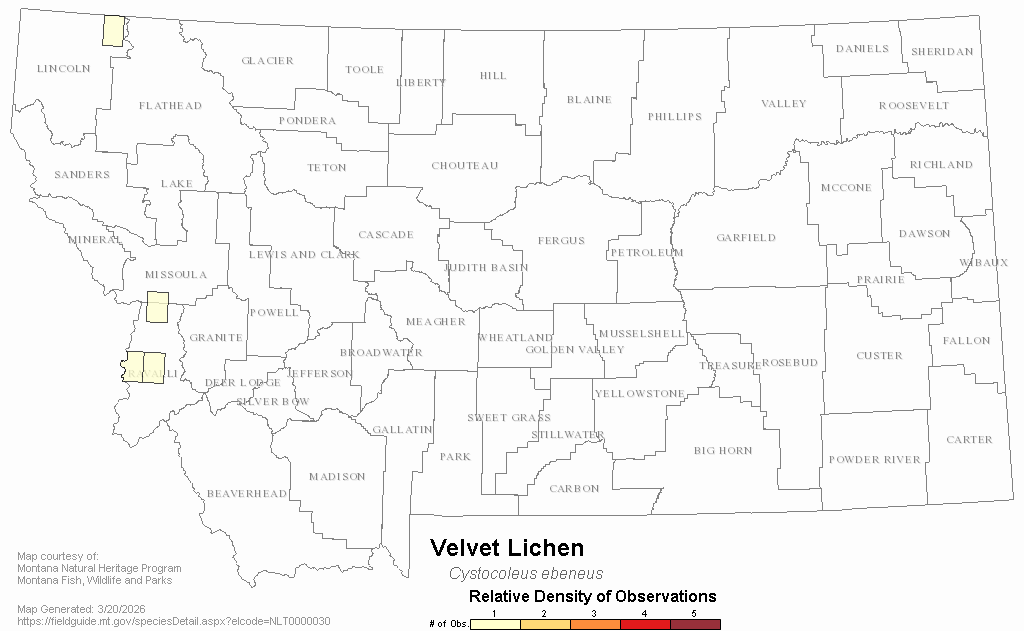 Velvet Lichen — Cystocoleus ebeneus.  Montana Field Guide.  .  Retrieved on , from