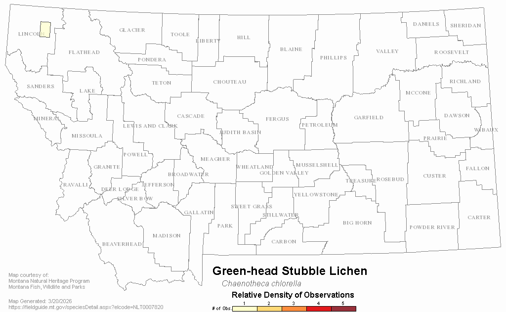Green-head Stubble Lichen — Chaenotheca chlorella.  Montana Field Guide.  .  Retrieved on , from