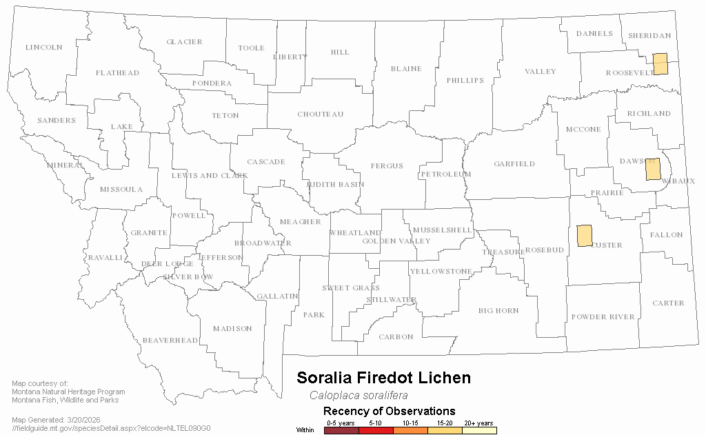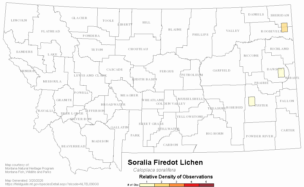 Soralia Firedot Lichen — Caloplaca soralifera.  Montana Field Guide.  .  Retrieved on , from